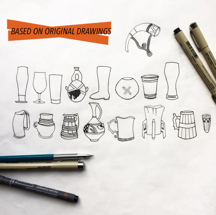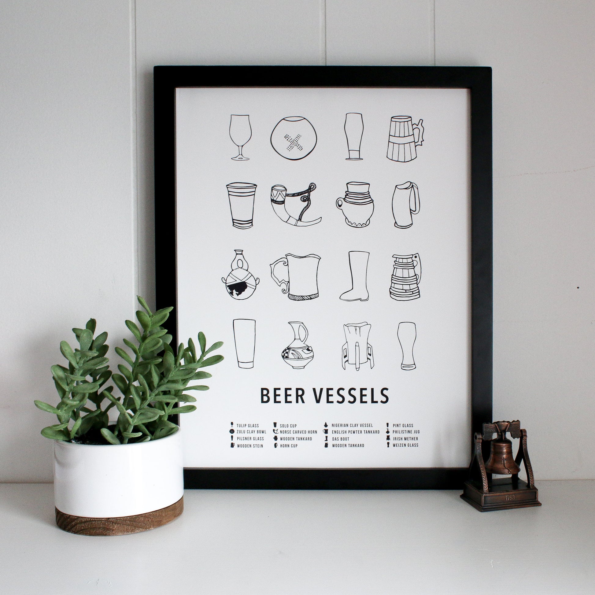 And ode to the ancient and (not so ancient) vessels that hold beer, from Zulu clay beer pots to the humble Solo cup! 'Key' to each beverage holder at the bottom of the print.
