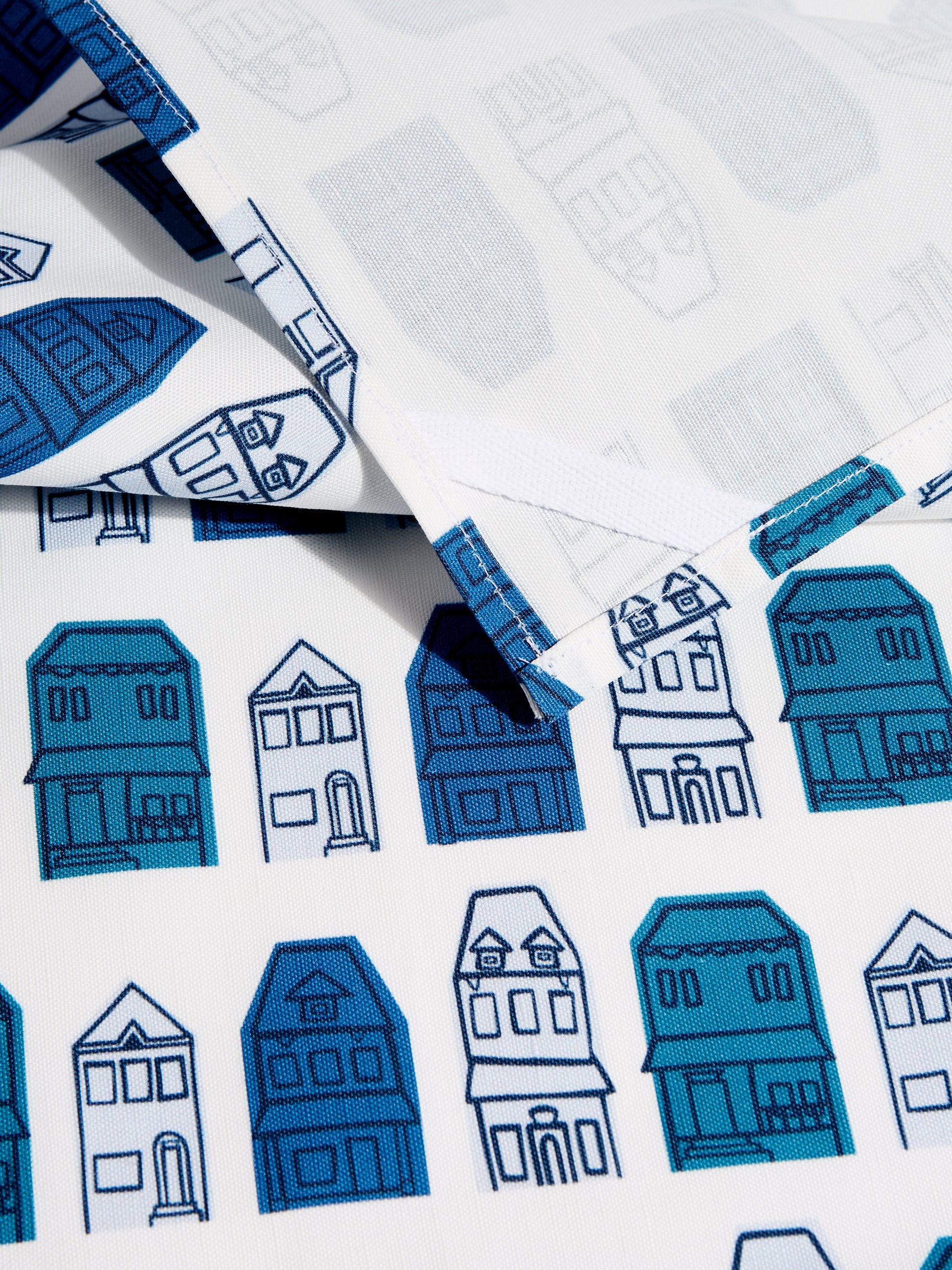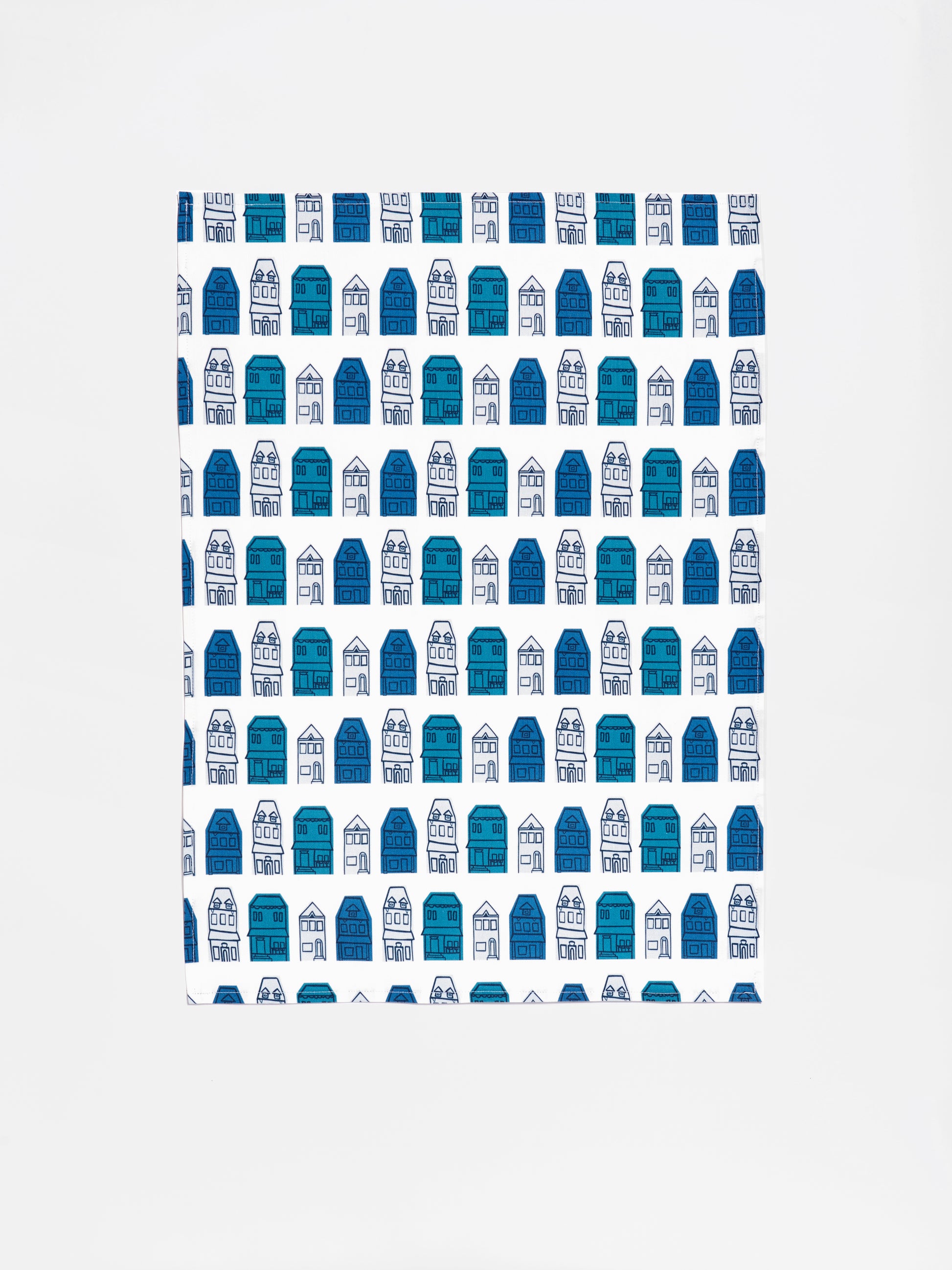 This playful print references the Historic Fan District neighborhood in Richmond, Virginia. Row houses in Blue and Teal feature in this joyful pattern.