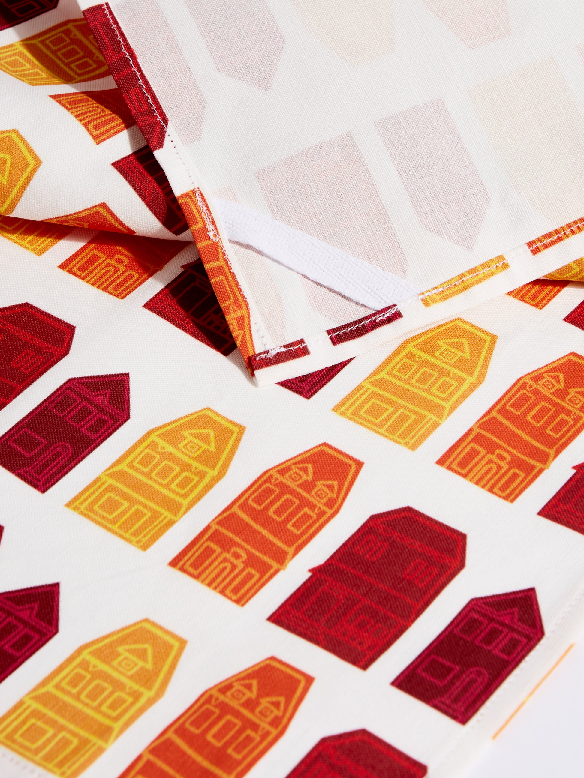 This playful print references the Historic Fan District neighborhood in Richmond, Virginia. Row houses in red, orange, and yellow feature in this joyful pattern.