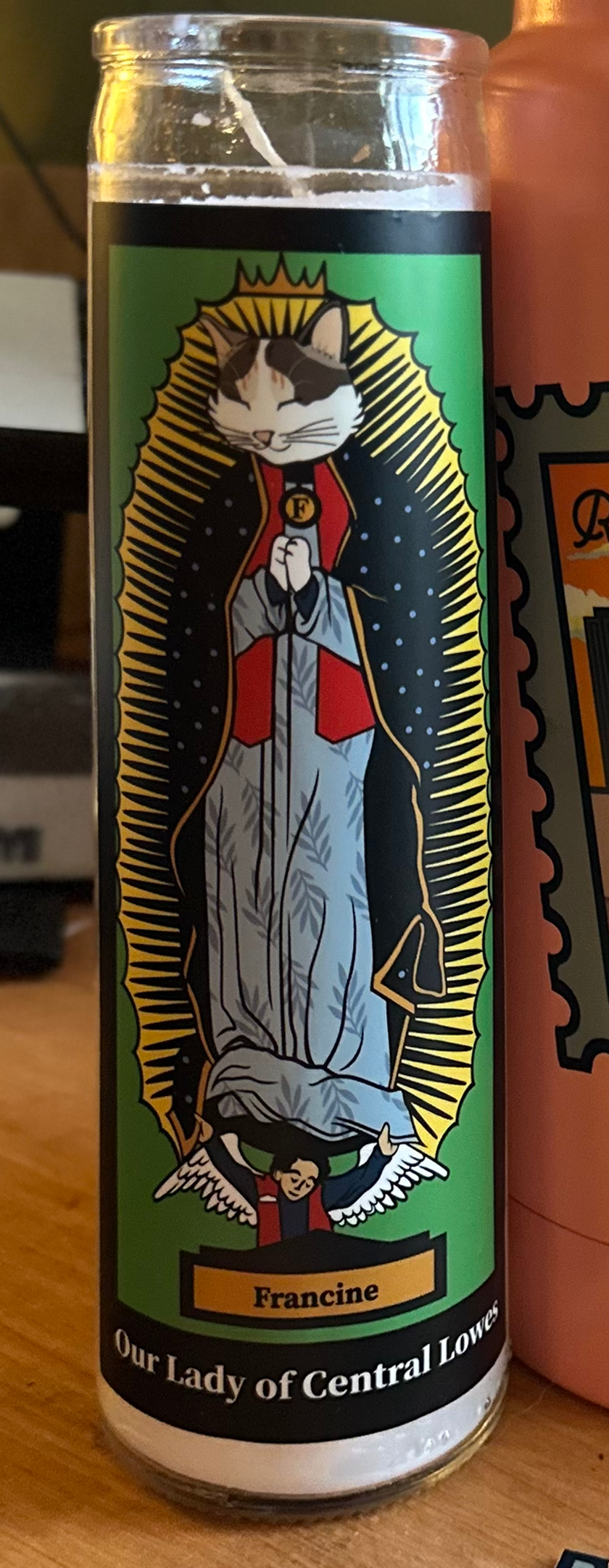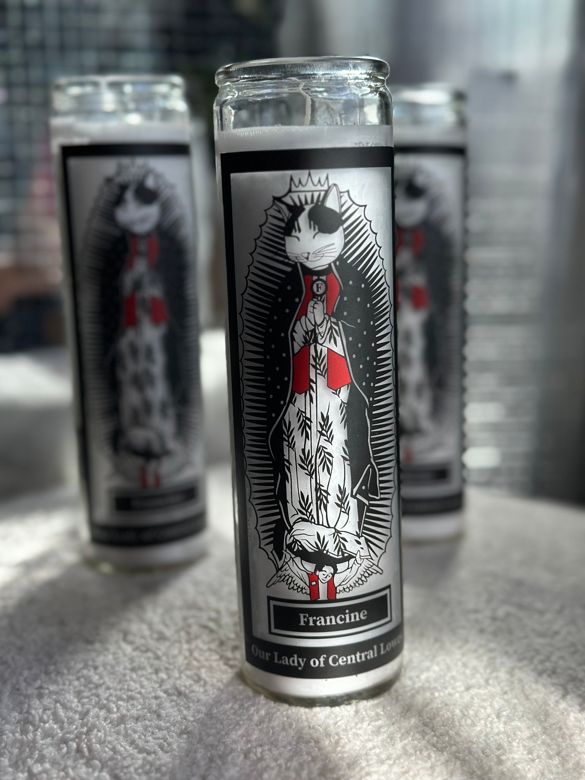 A humble prayer or devotional candle to Richmond icon Francine, the Lowe's cat. Original illustration by Morris + Norris.